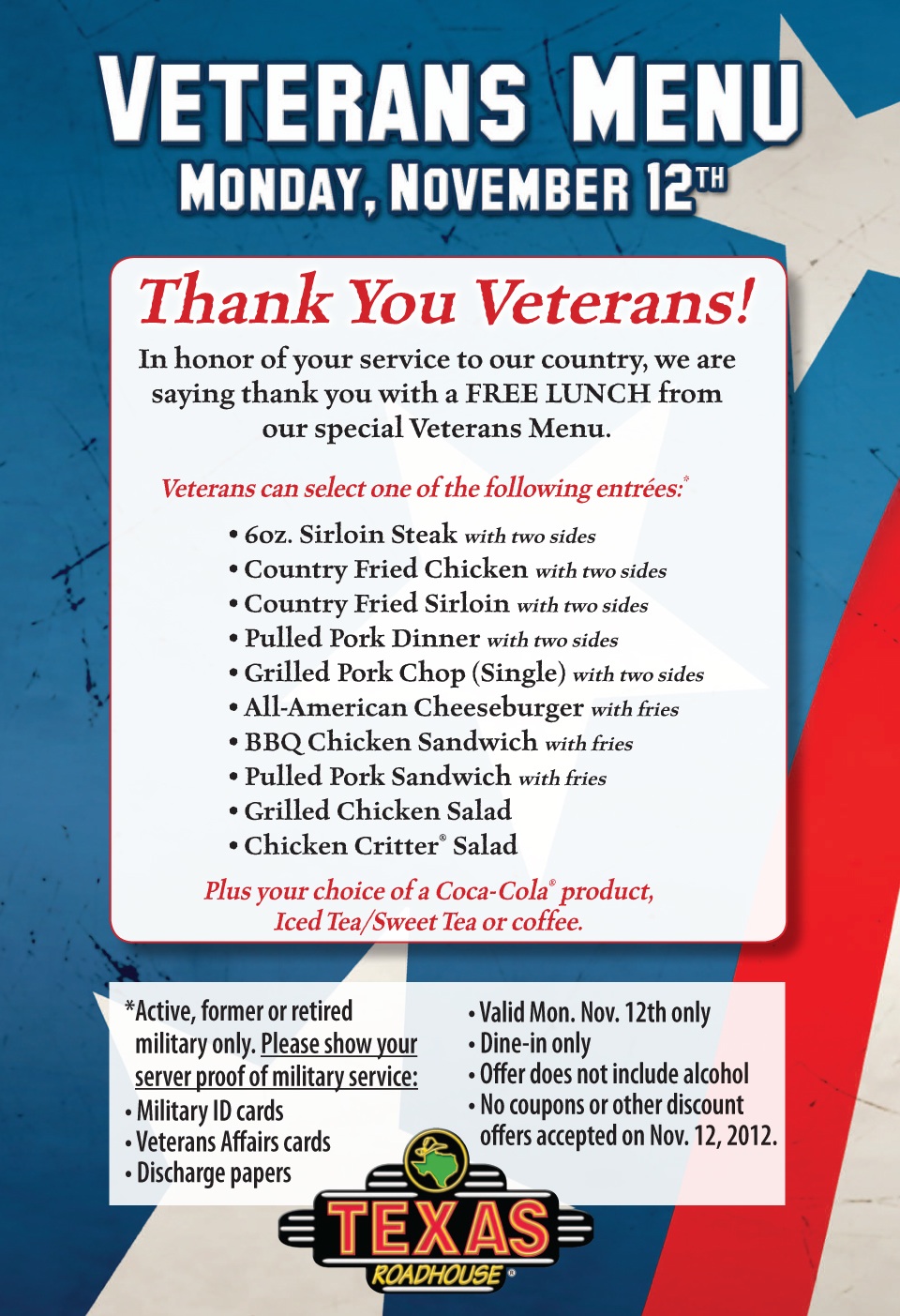 From a Veteran who has much respect for Veterans and Active Service Military Personnel I wanted to share that Texas Roadhouse is offering a free lunch to those who have served. Please review the details below, and look forward to a story coming up about my veteran service, dedication to others, and a brick that hopefully will stand the test of time! For now, I salute all those serving, and who have served, and give my hearts glad-full Thank You!