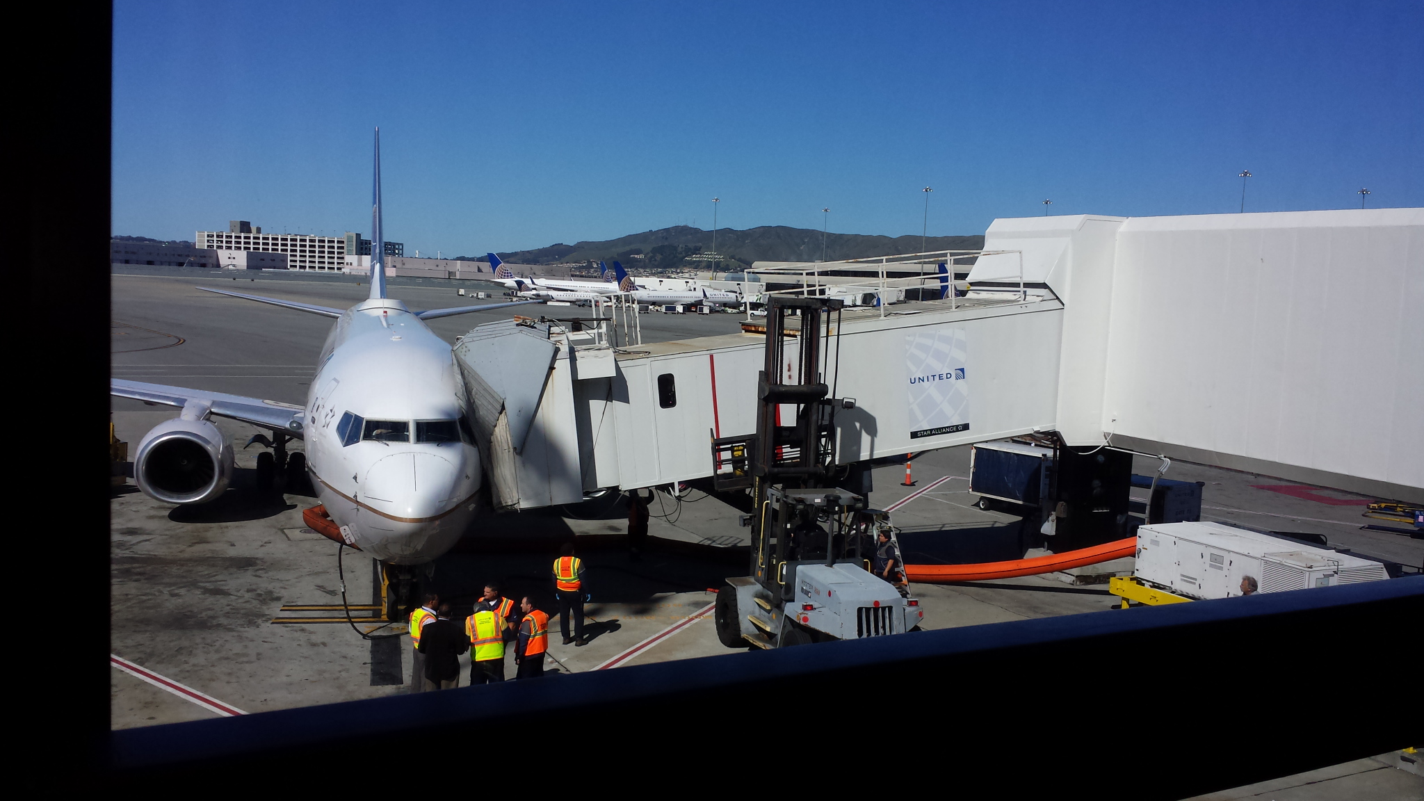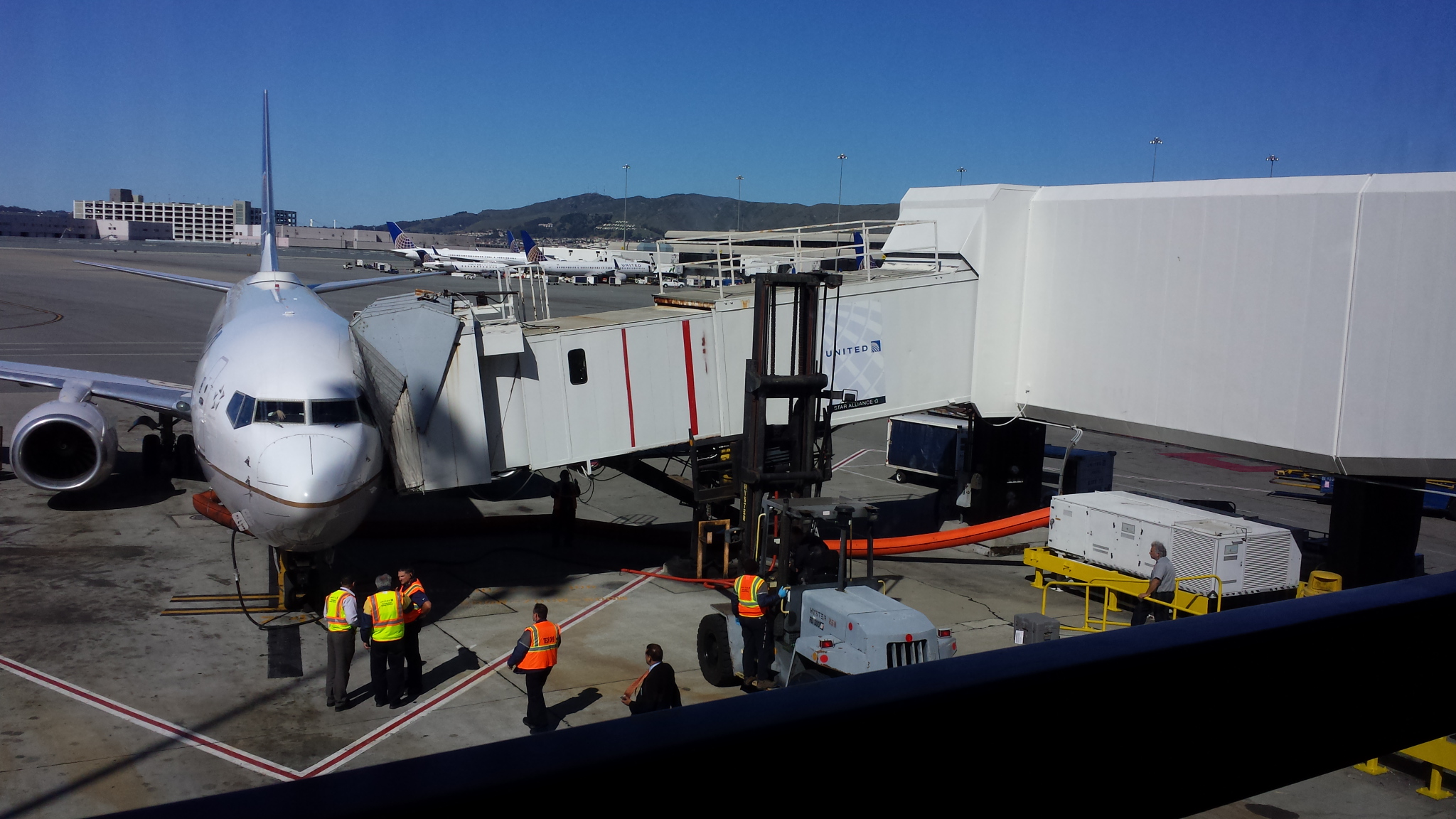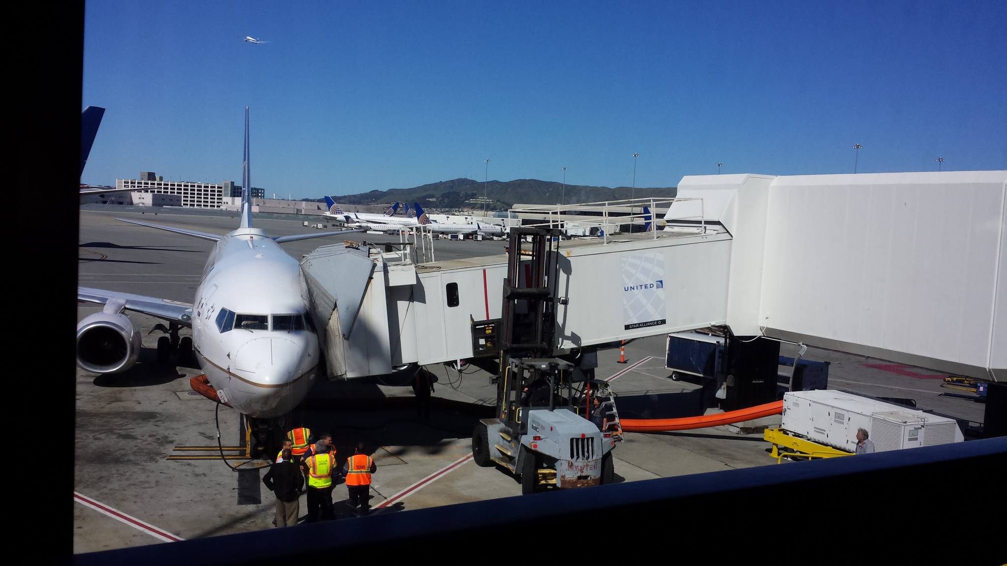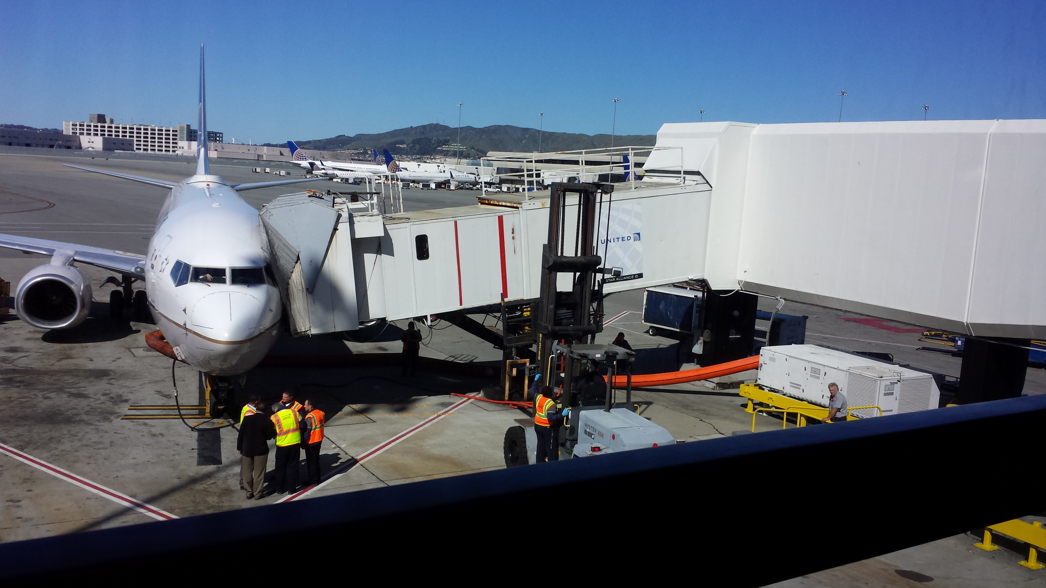 They had to use a forklift, to keep the bridge steady, and secure enough for everyone to get off the plane. Well, just shortly after everyone was off the plane, we get the announcement, that we are to move from gate 74, over to 73, as they plan to move the plane. This sets us back another hour and a half, as they have to move and clean the airplane. I understand this, but again just one of the hiccups of the flight to come.