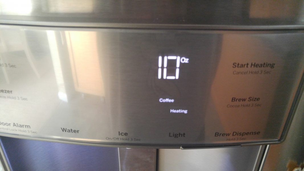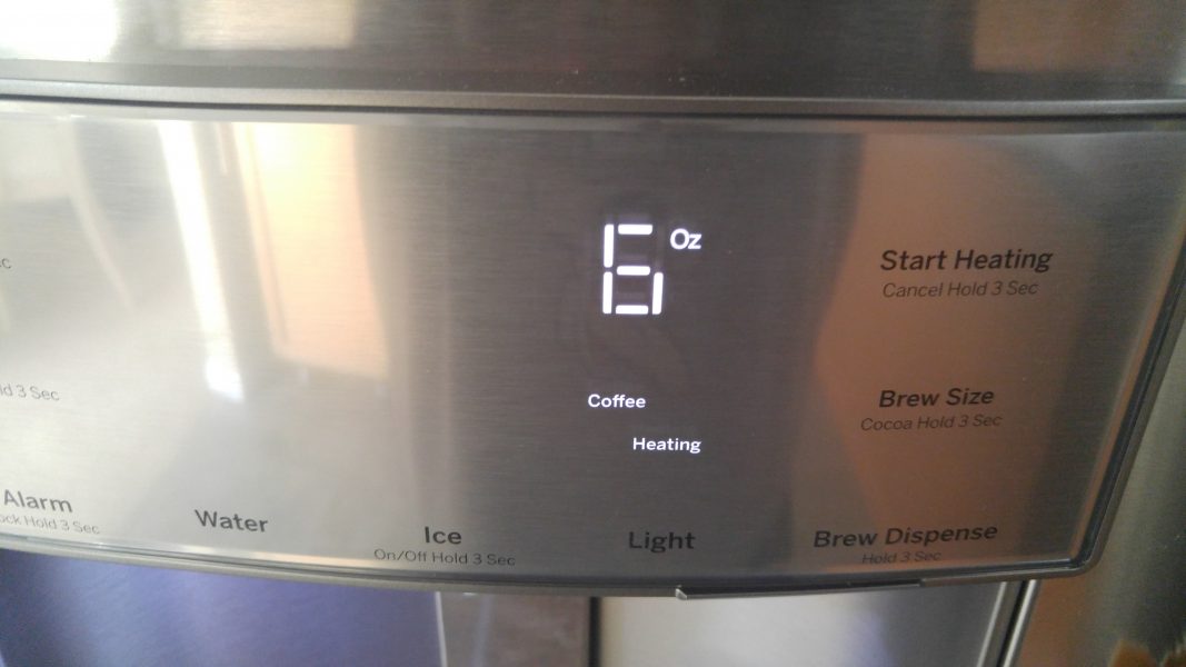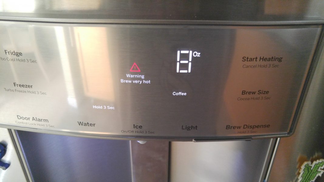This GE Refrigerator allows you to set up a Wi-Fi connection so you can monitor and change the temperature, get alerts when the temperature drops, and for example it can schedule hot water to be ready when you want a cup of coffee . So you wake up in the morning and have it scheduled ready for 7:30am, put the K-Cup in and hit the dispense button. There you go, a hot cup of coffee to start the day.